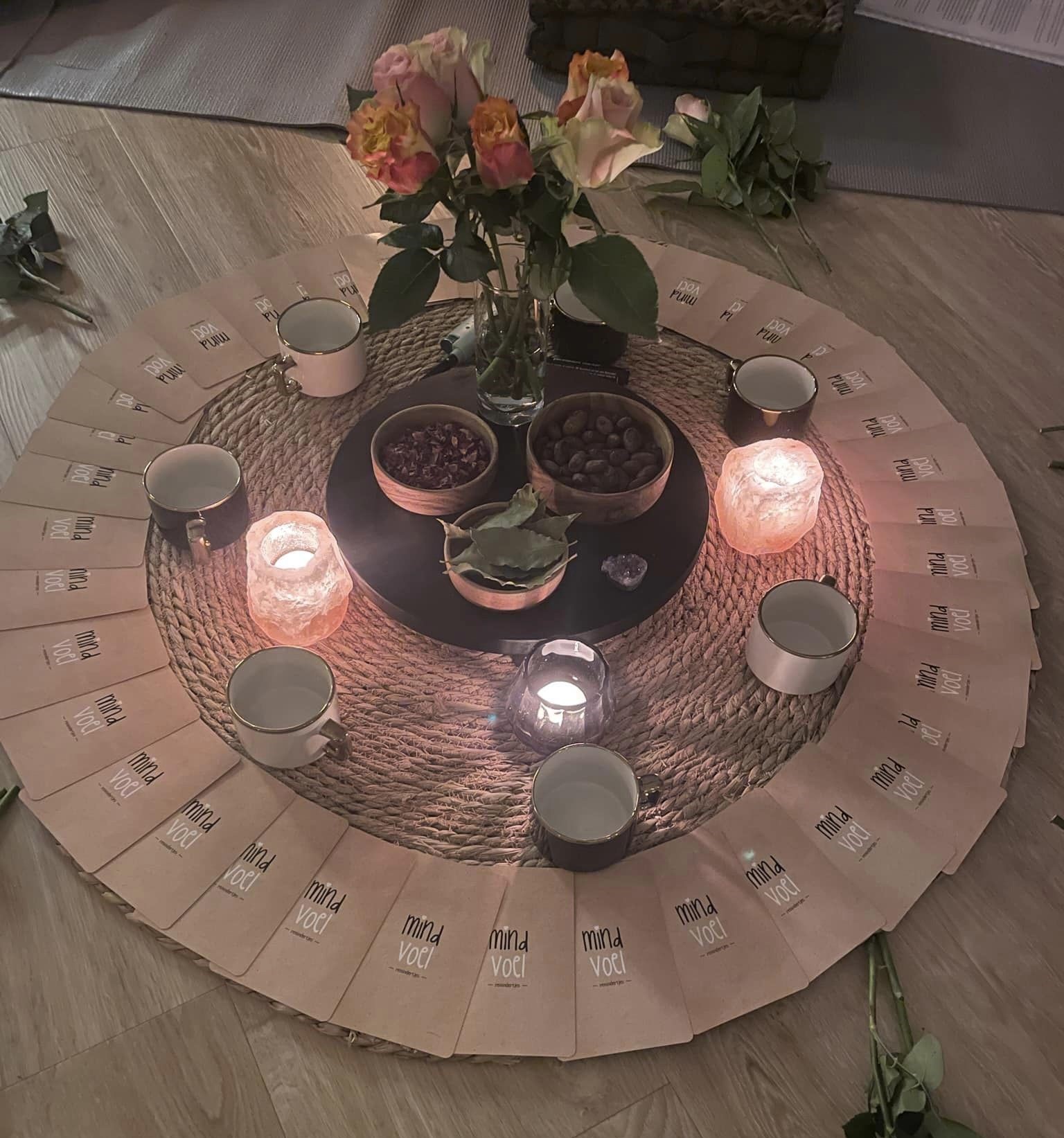 Elke cacao ceremonie begint met een warm welkom en een korte kennismaking. We creëren een veilige, vertrouwde sfeer en bespreken samen een persoonlijke intentie die we in de ceremonie centraal stellen.